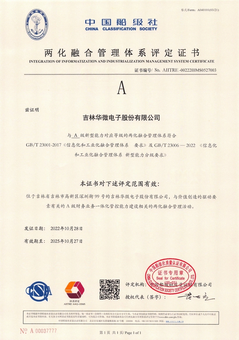 两化融合管理体系评定证书